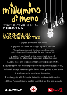 Torna come ogni anno l'appuntamento con M'illumino di Meno, la festa del risparmio energetico giunta all'undicesima edizione, indetta dal programma radiofonico Caterpillar di Rai - Radio2. La Croce Rossa Italiana non poteva non partecipare anche quest'anno con più di 50 attività di attività su tutto il territorio nazionale. Scoprile tutte e partecipa anche tu alle iniziative!